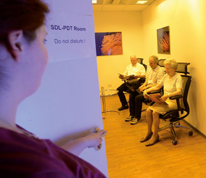 The optimal room size is 3m x 4m – if needed, the system can be adapted. The required artificial light sources are operated in suitable light fittings in the treatment room. The interior design can be arranged to personal taste. During the treatment, patients can have a conversation, rest, listen to music, watch television or read. The room can be used for other purposes when not needed for PDT