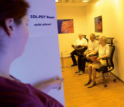 Die optimale Raumgröße beträgt 3m x 4m – bei Abweichungen kann das System angepasst werden. Die erforderlichen künstlichen Lichtquellen werden in passenden Leuchten im Behandlungsraum betrieben. Die innenarchitektonische Raumgestaltung kann nach persönlichem Geschmack erfolgen. Die Patienten können sich während der Behandlung unterhalten, ruhen, Musik hören, Fernsehen oder lesen. Der Raum kann, wenn er gerade nicht für eine PDT benötigt wird, auch weiterhin anders genutzt werden.